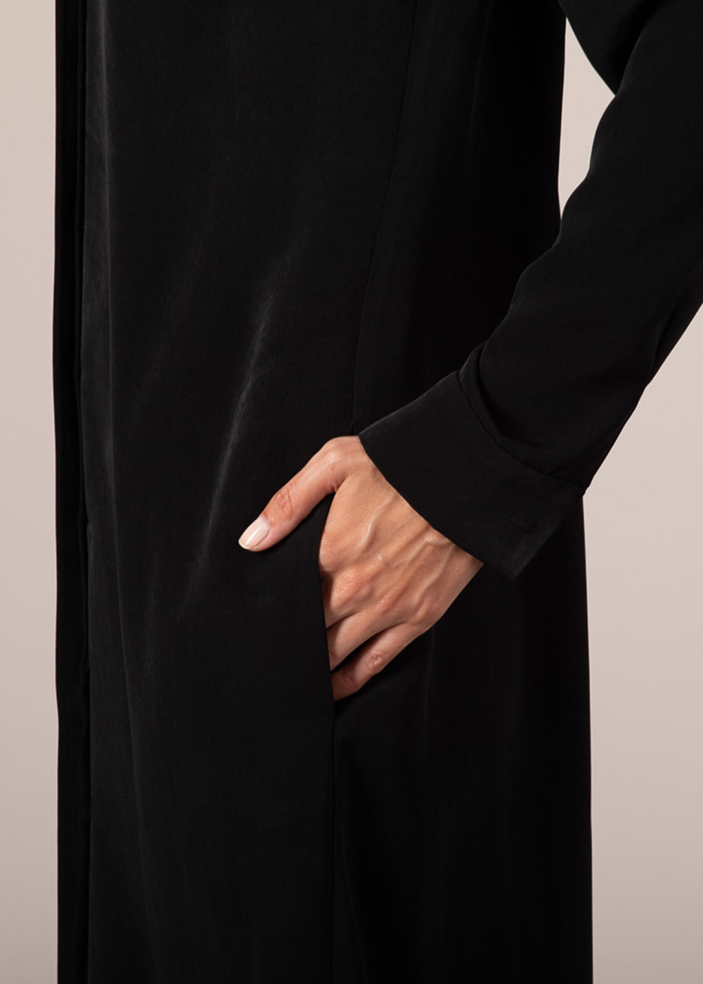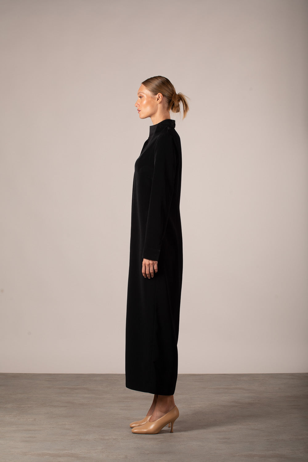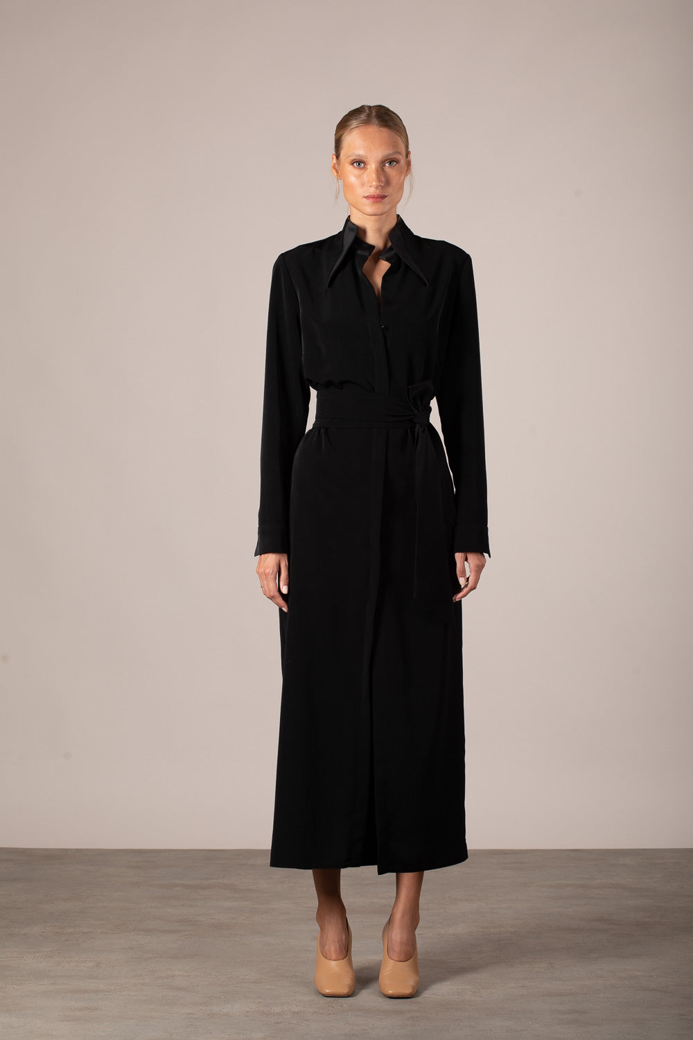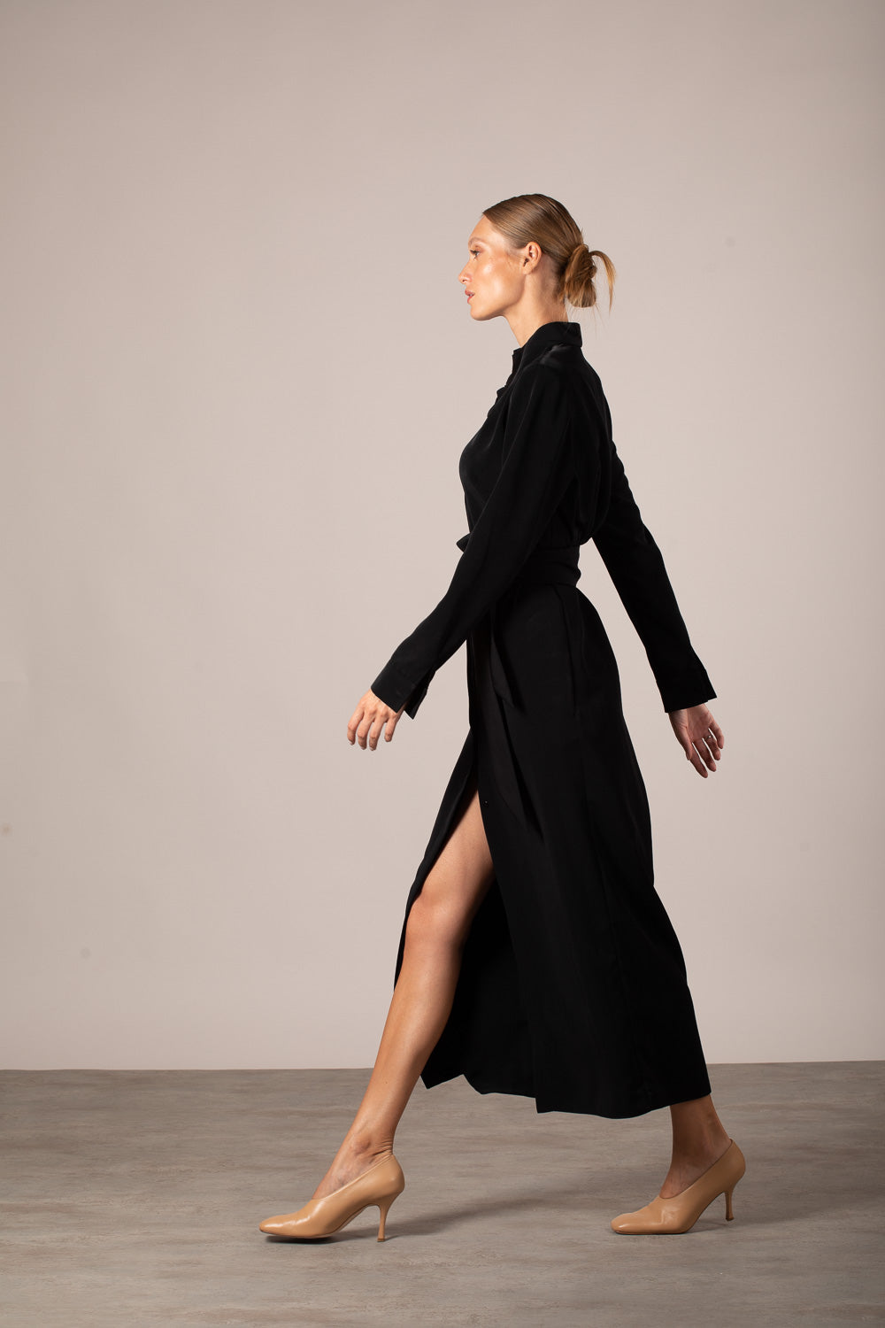 It’s the ultimate black dress, but with more options: it can be worn as a super flattering evening dress, or lose the belt and your dress just became a caftan.