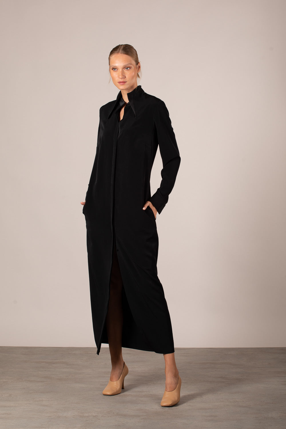 Details to love: Geometric and unique double collar, invisible button panel, wide kimono belt and of course: side pockets.